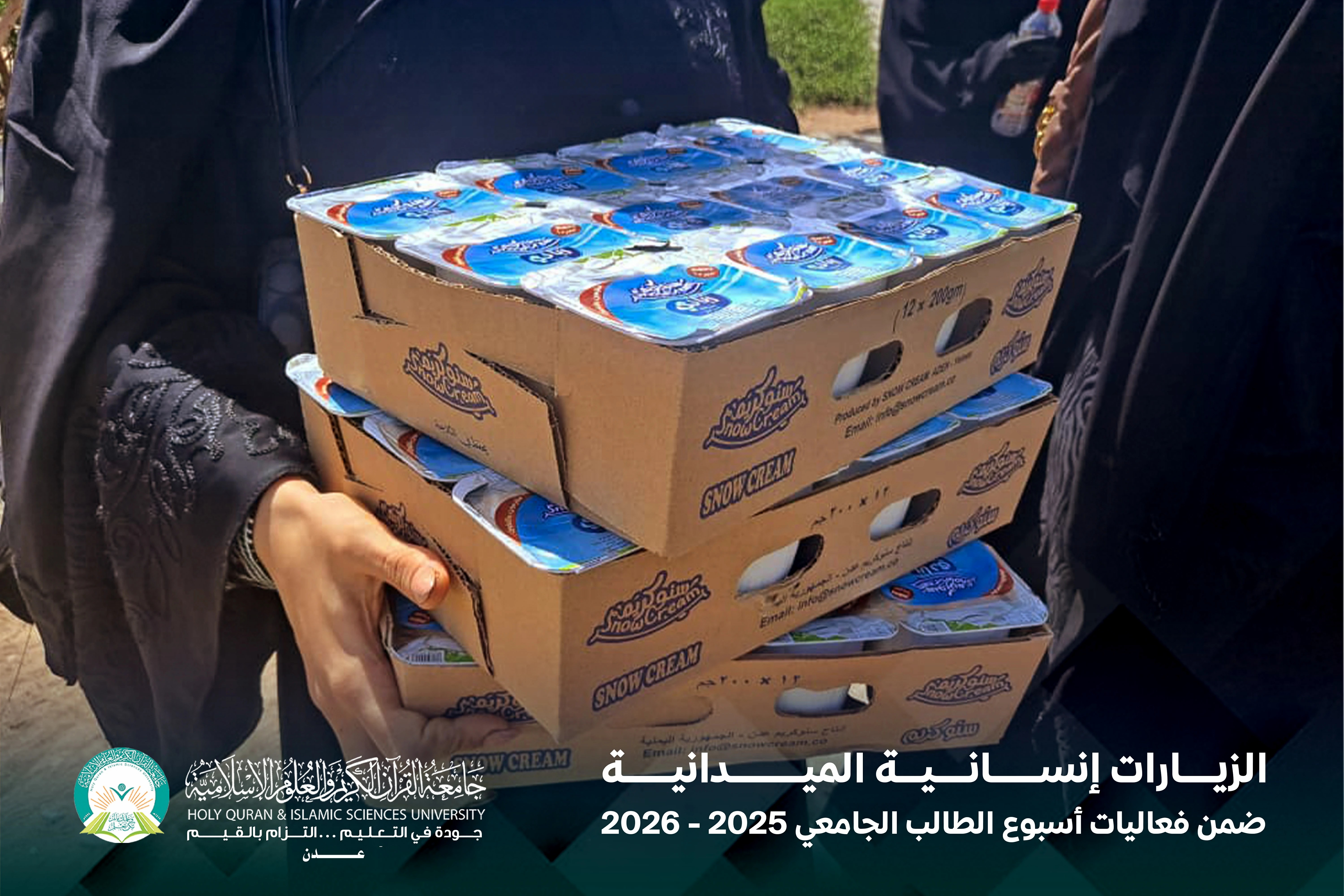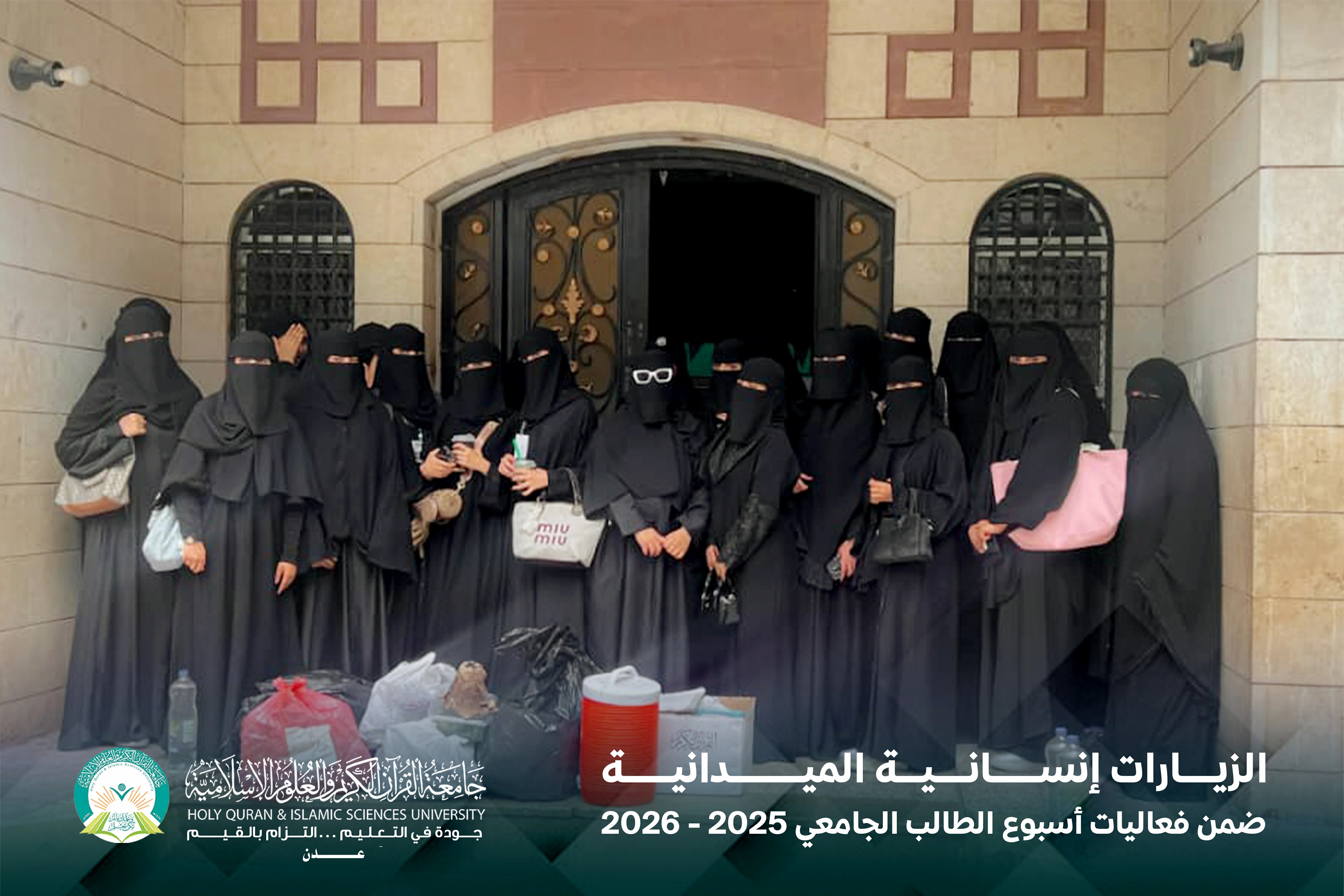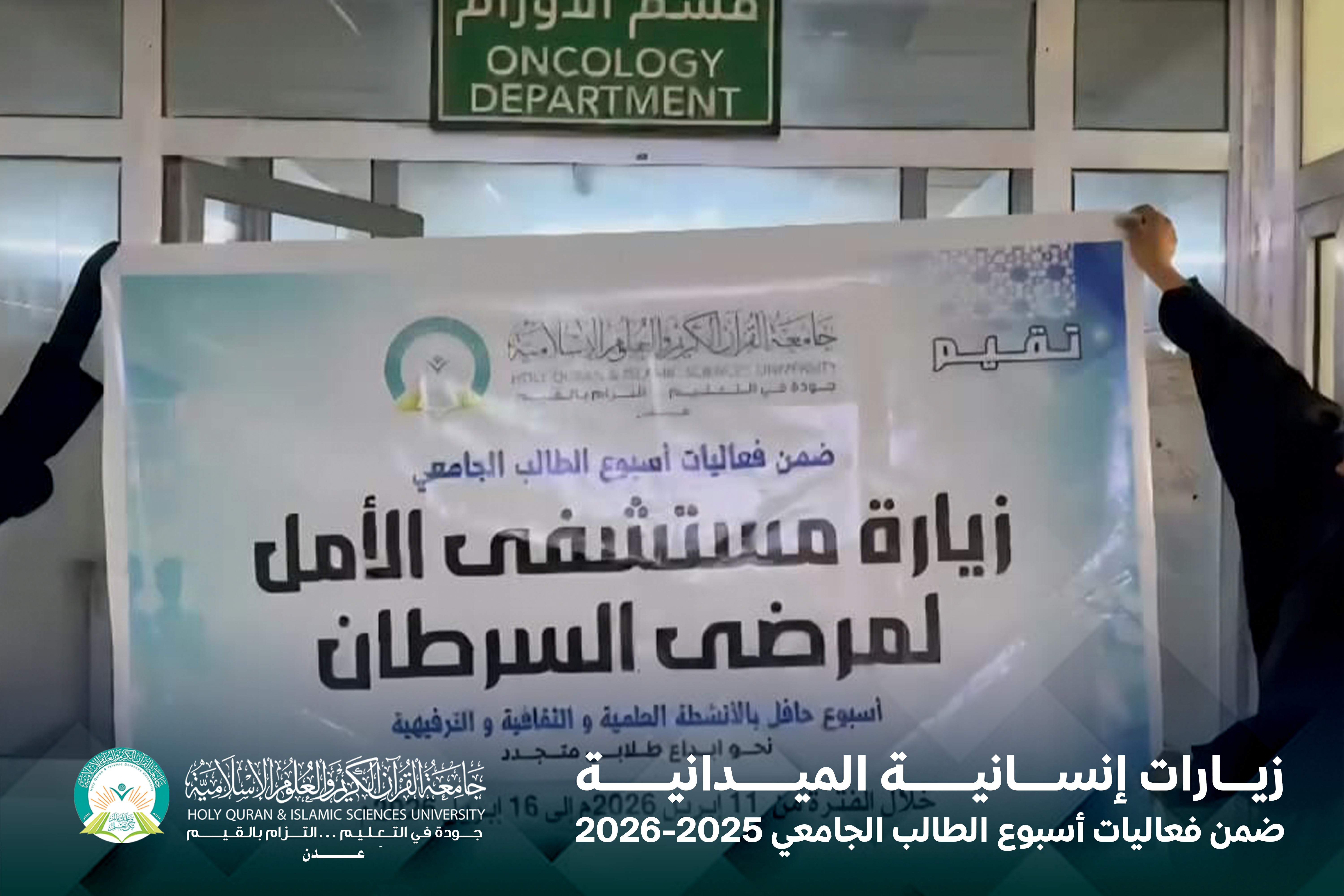 في إطار فعاليات أسبوع الطالب الجامعي، نظّمت جامعة القرآن الكريم والعلوم الإسلامية – عدن سلسلة من الزيارات الإنسانية بمشاركة فاعلة من الطلاب والطالبات، وذلك في إطار ترسيخ قيم التكافل الاجتماعي وتعزيز الدور المجتمعي للطالب الجامعي.