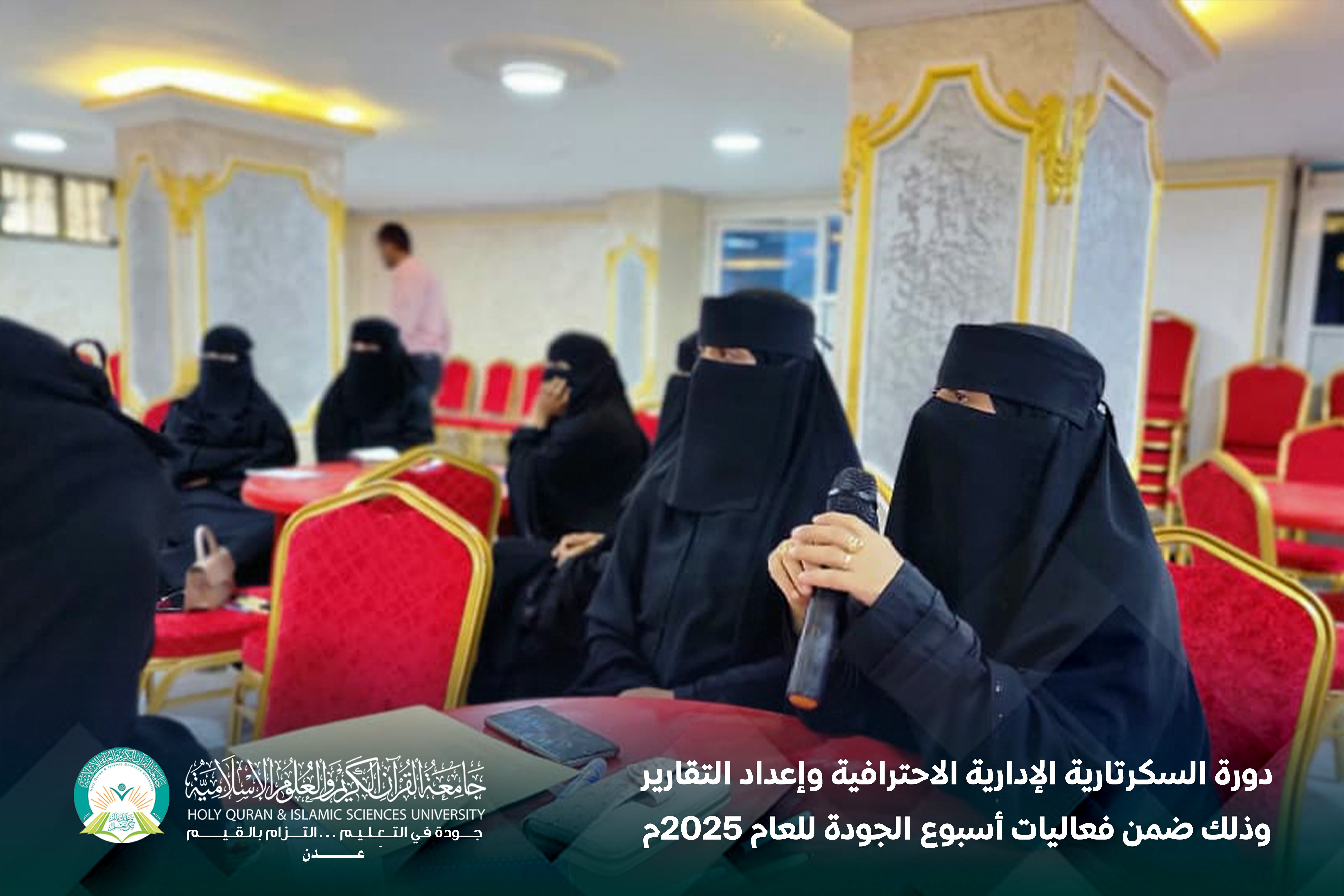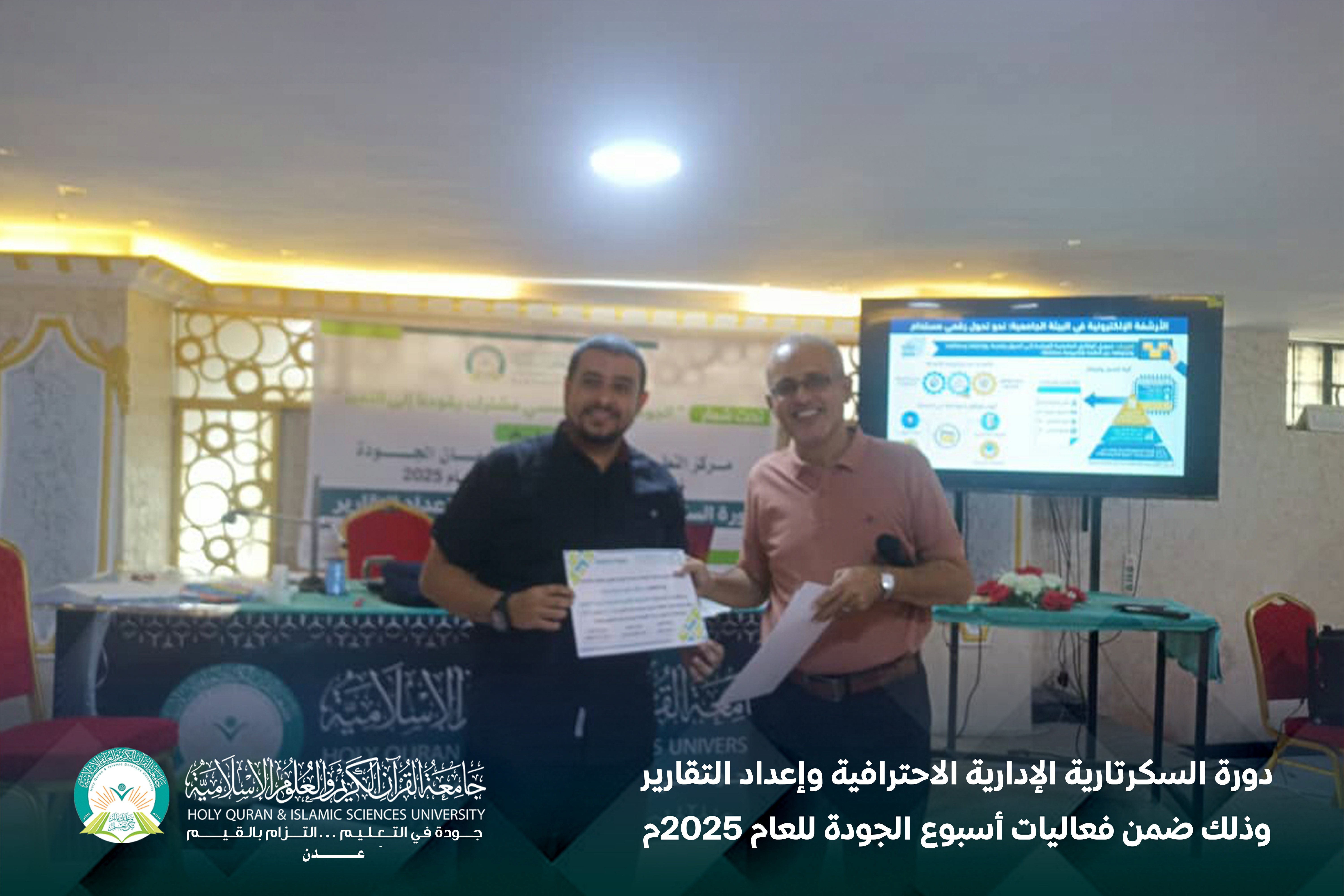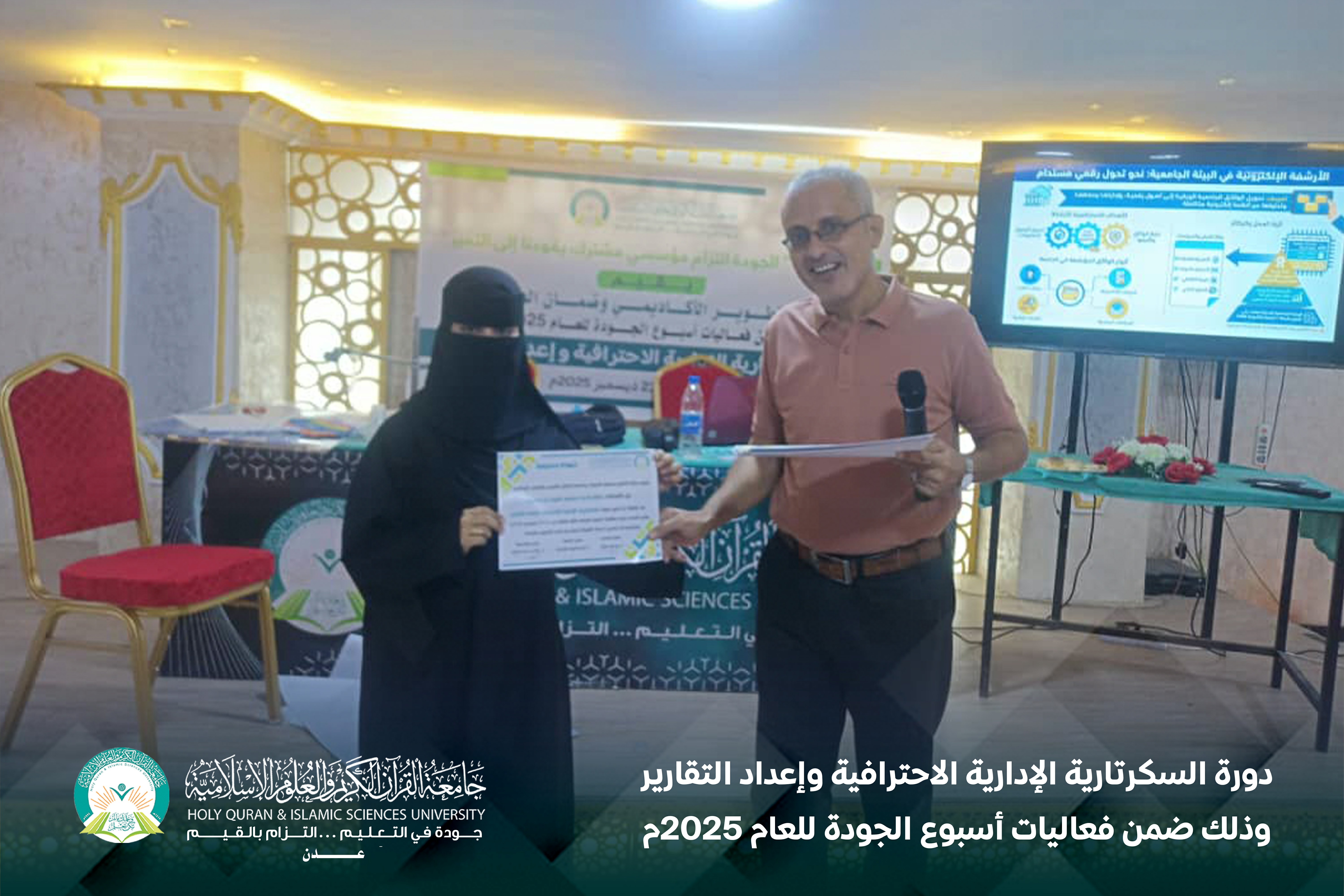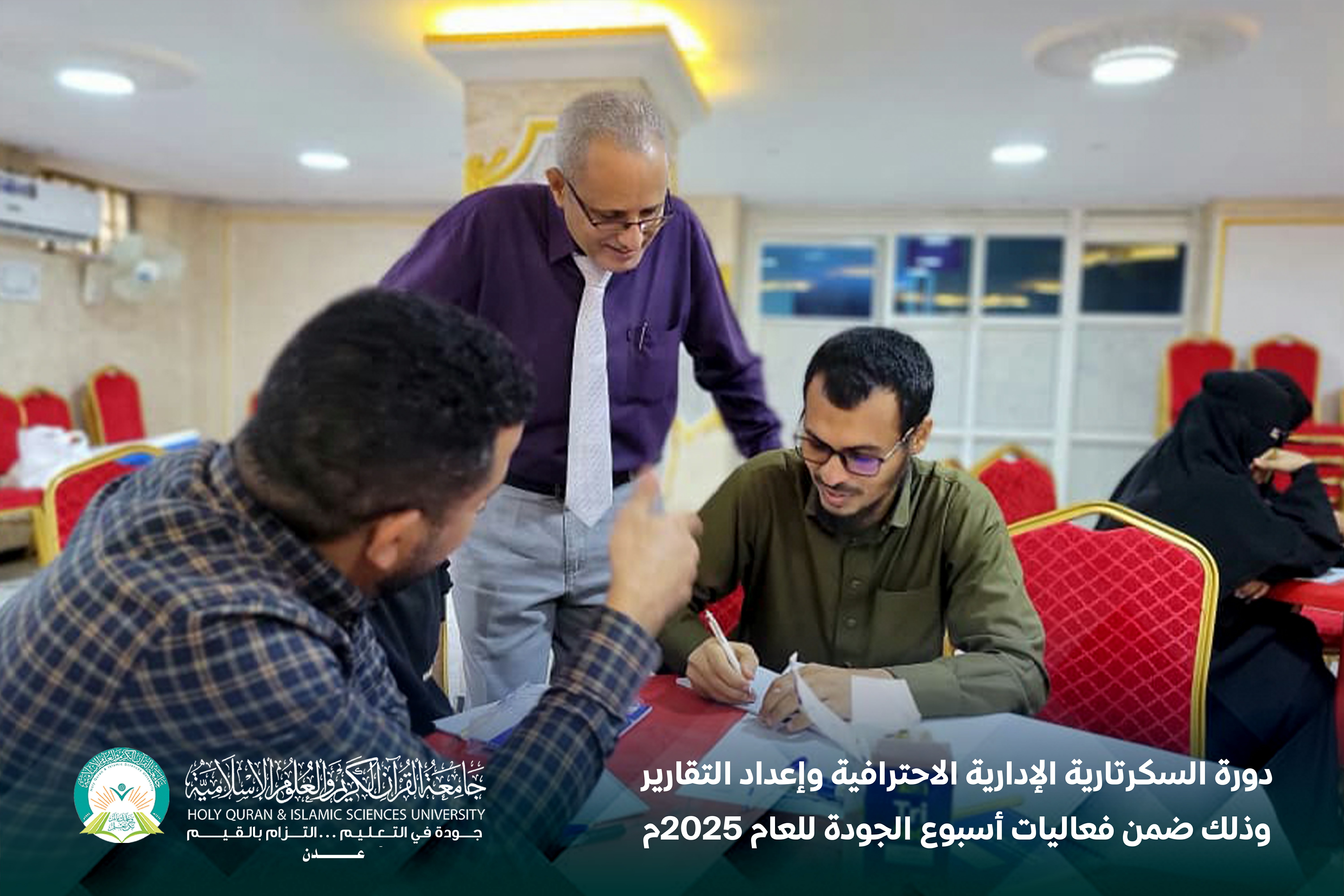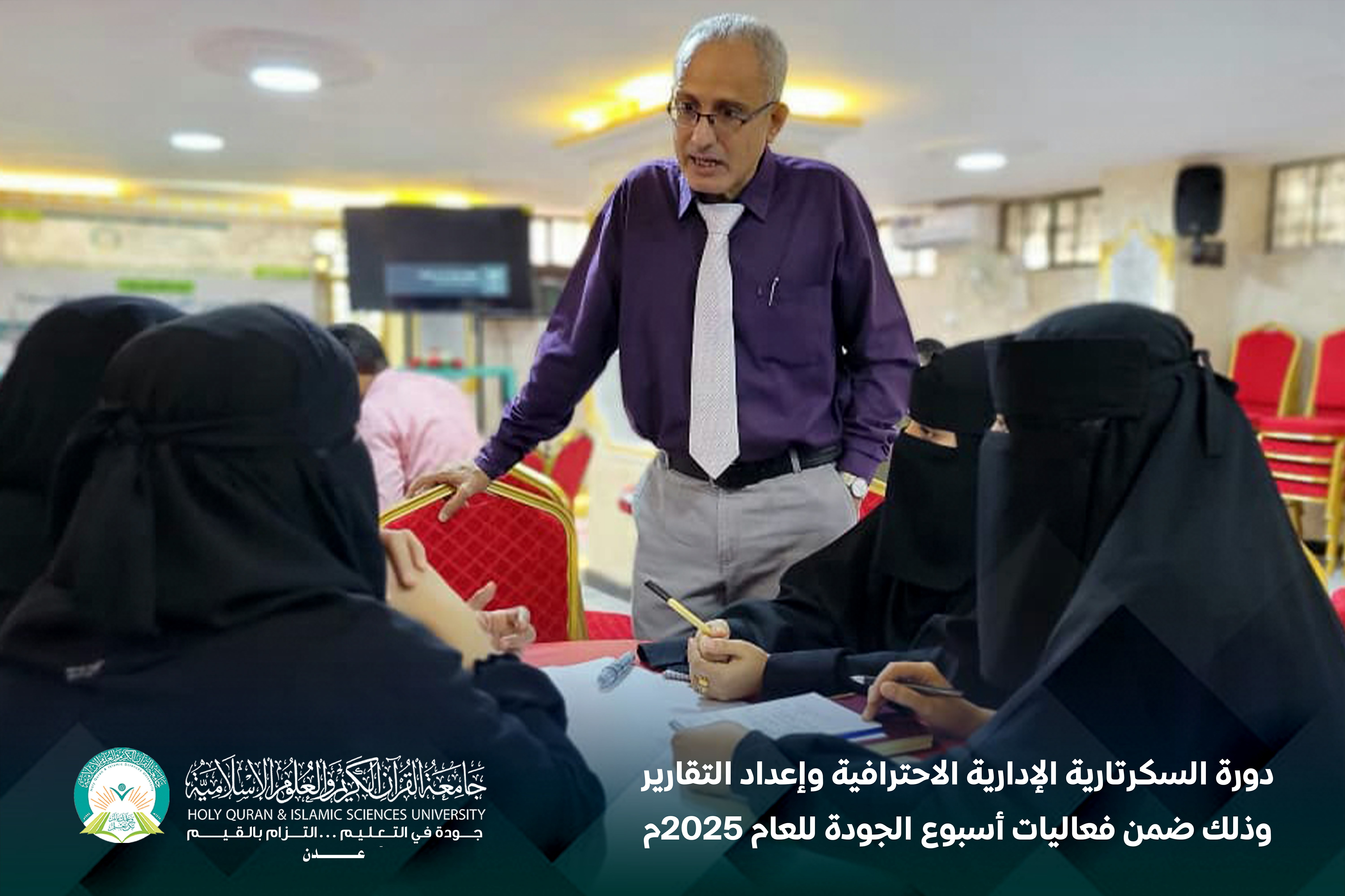 تحت شعار «الجودة التزام مؤسسي مشترك يقودنا إلى التميز»، أقام مركز التطوير الأكاديمي وضمان الجودة بجامعة القرآن الكريم والعلوم الإسلامية – عدن، دورة السكرتارية الإدارية الاحترافية وإعداد التقارير، وذلك ضمن فعاليات أسبوع الجودة للعام 2025م، خلال الفترة من 23 إلى 24 ديسمبر.