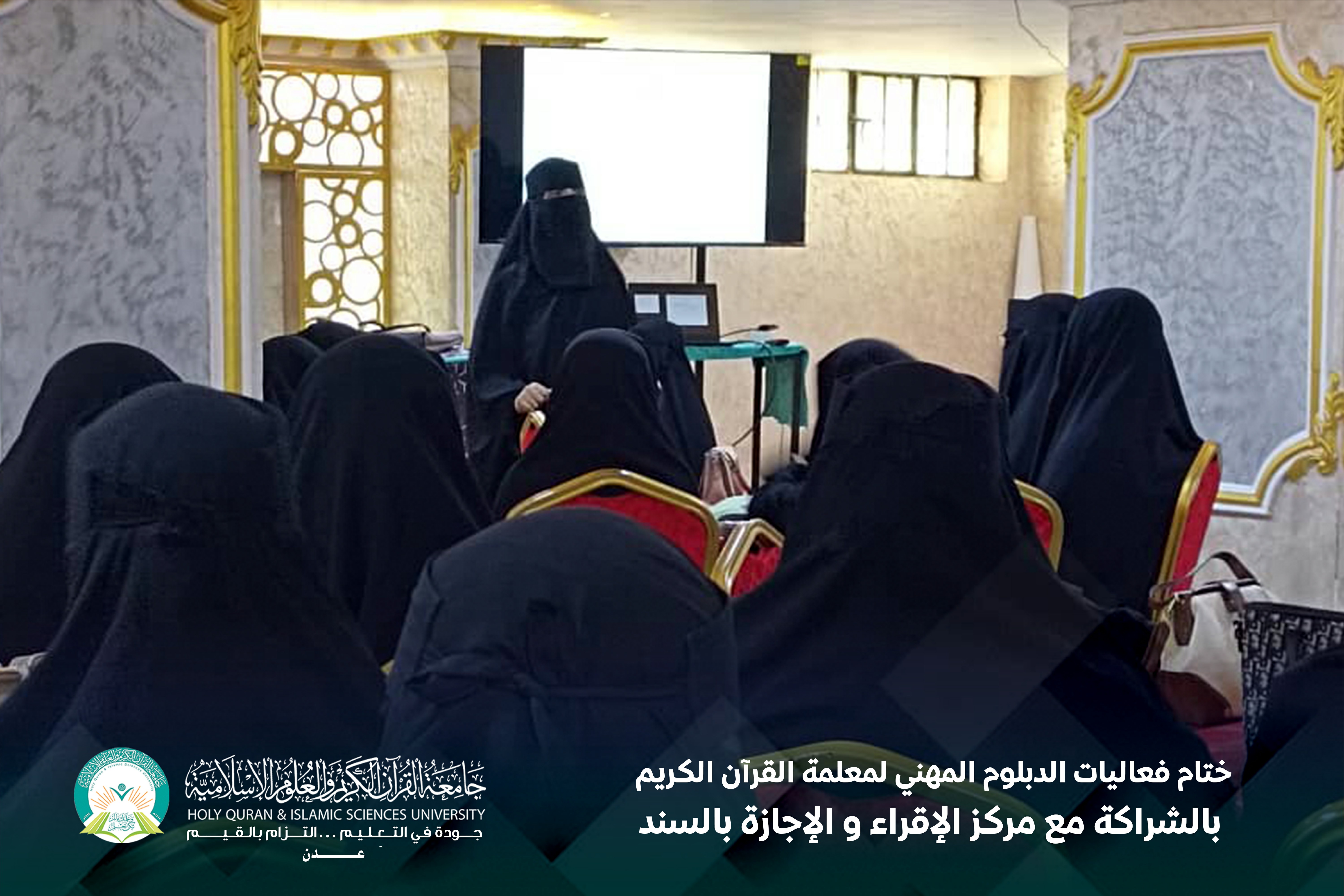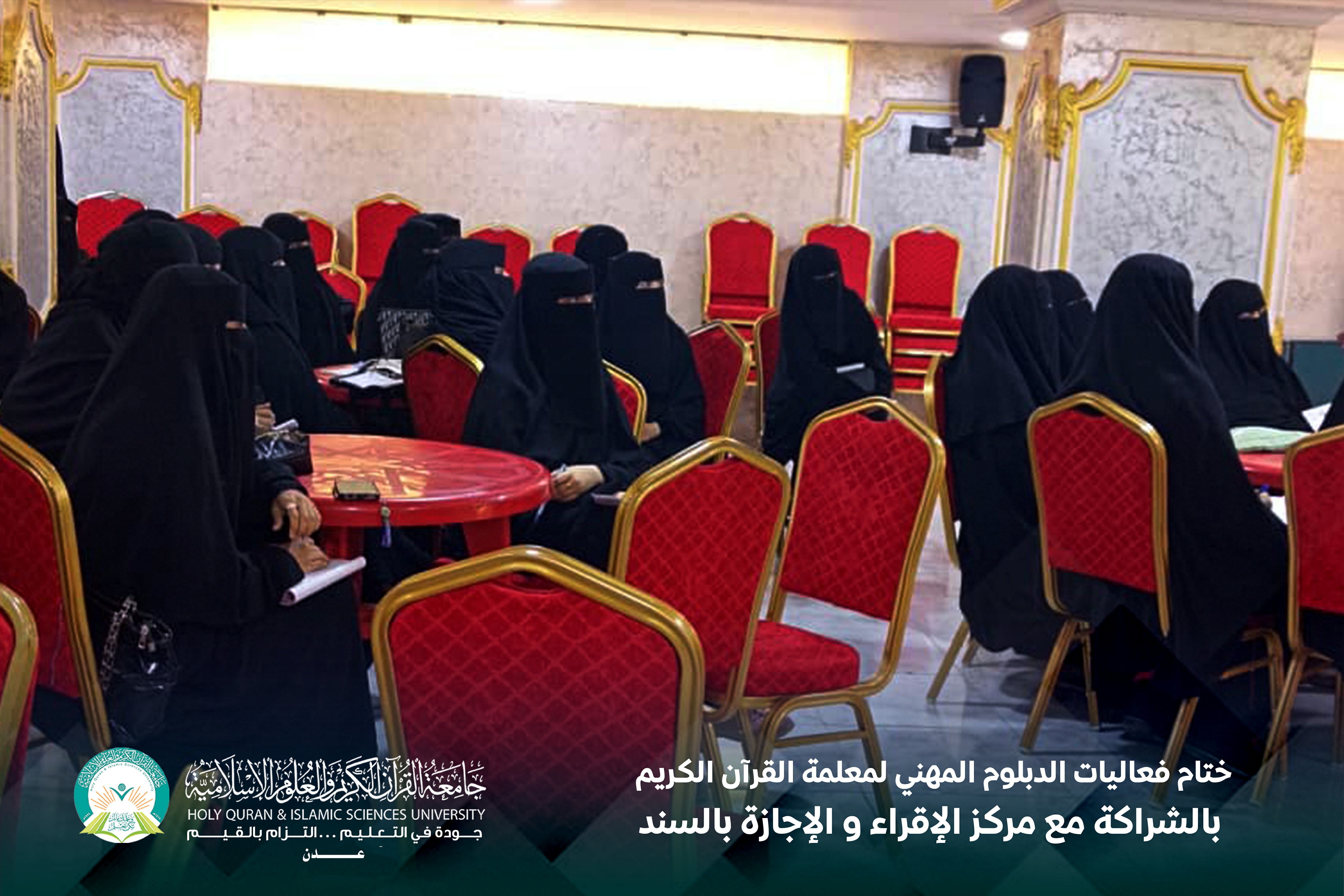 اختتمت جامعة القرآن الكريم والعلوم الإسلامية – عدن، باشراكة مع مركز الإقراء والإجازة بالسند، فعاليات الدبلوم المهني لمعلمة القرآن الكريم، وذلك في إطار جهودها الرامية إلى تأهيل كوادر تعليمية متخصصة تجمع بين الإتقان العلمي والكفاءة التربوية في مجال تعليم كتاب الله تعالى.