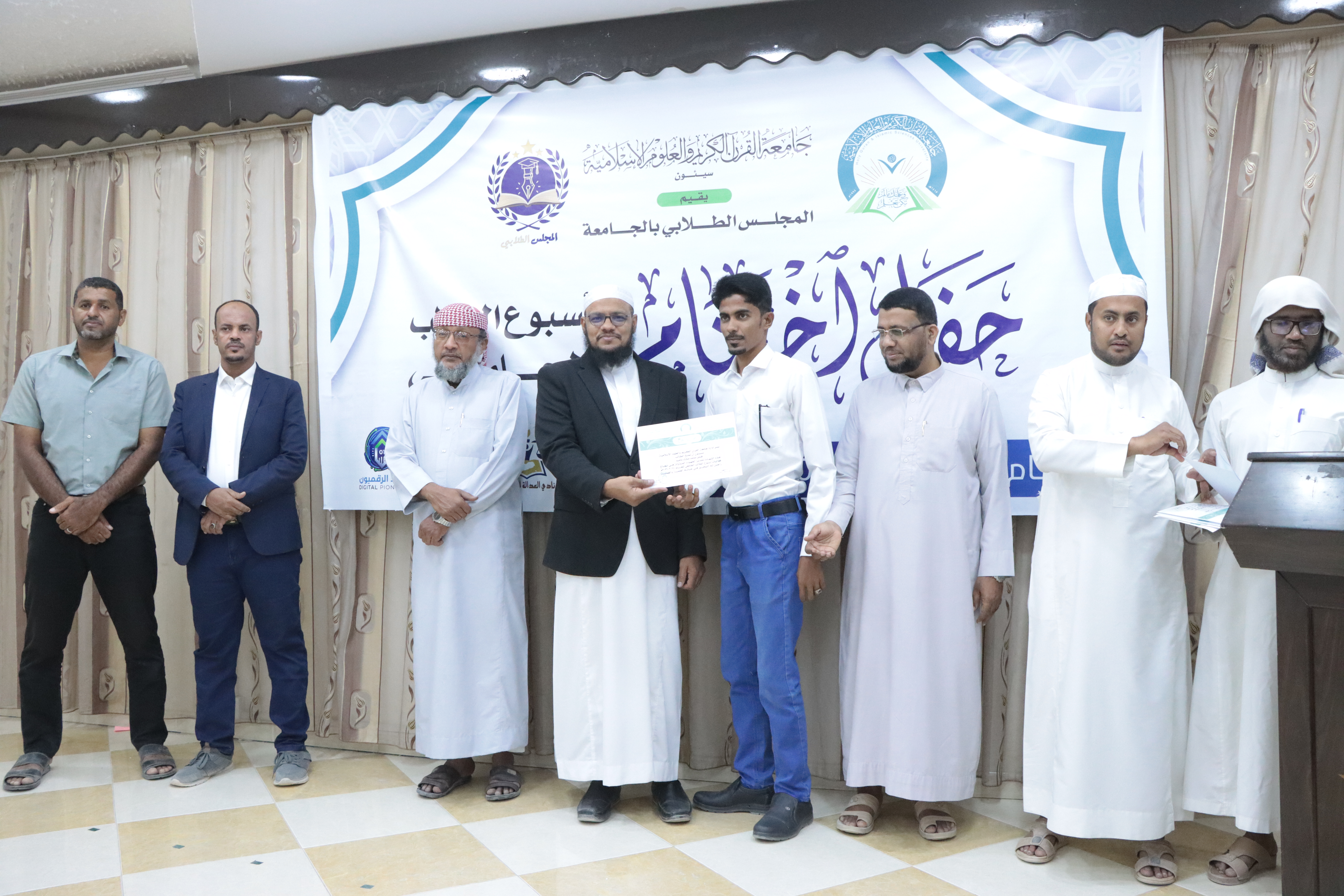 وفي حفل الاختتام، جرى تكريم الطلاب والطالبات الحاصلين على درجة الامتياز، والمشاركين في المسابقات الثقافية والإلقاء، إلى جانب المشاركين في تنظيم المعارض العلمية، بحضور قيادات الجامعة وأعضاء الهيئة التدريسية وجمع من الطلاب.