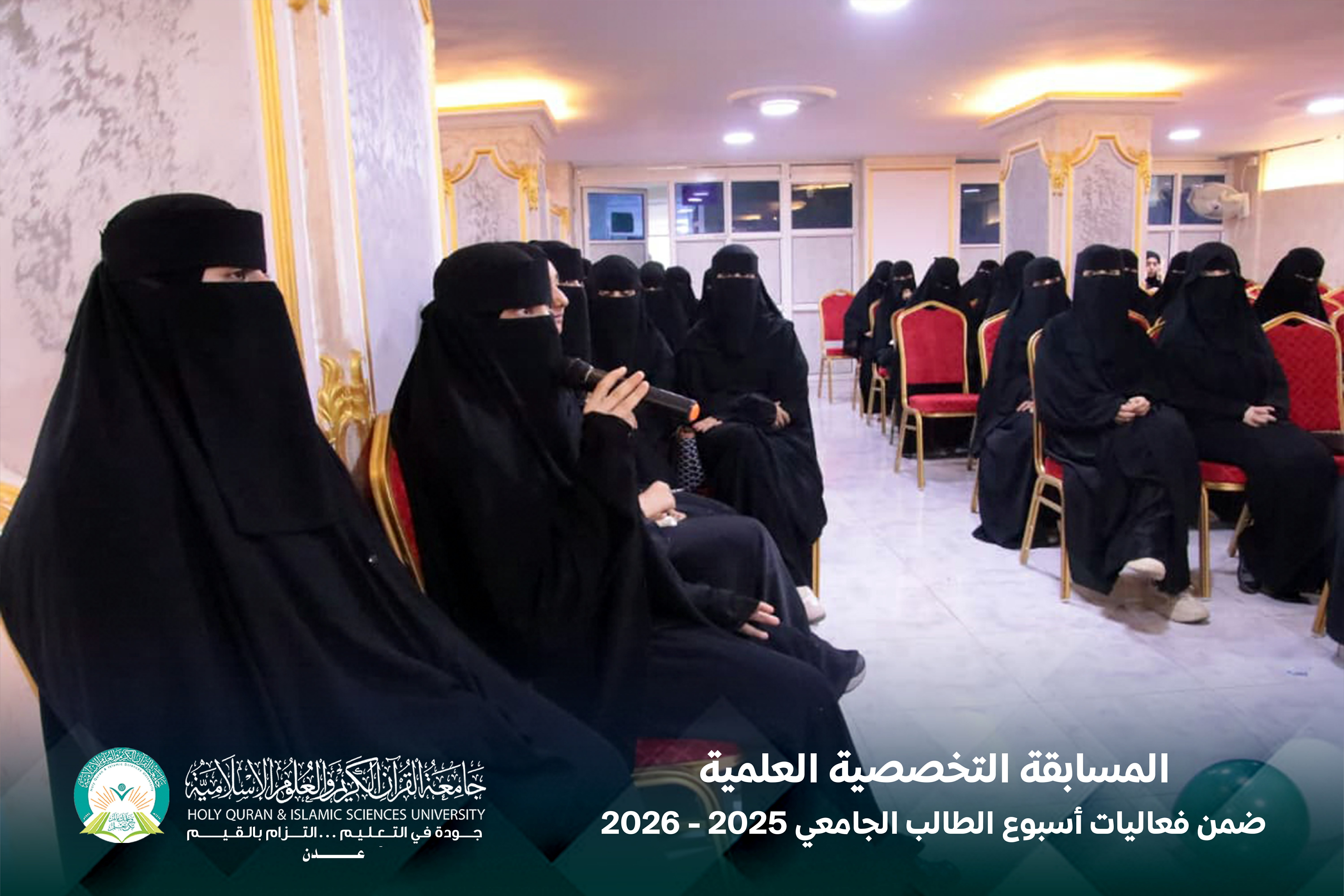 تتواصل فعاليات أسبوع الطالب الجامعي في جامعة القرآن الكريم والعلوم الإسلامية – عدن، في أجواء أكاديمية متميزة تعكس مستوى التفاعل الإيجابي والحيوية التي يتمتع بها الطلبة.